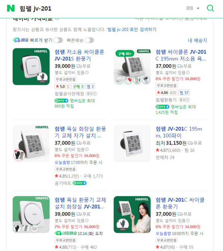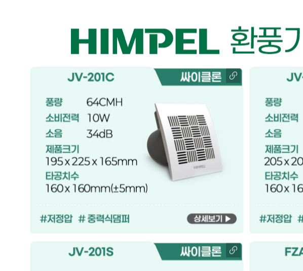 내부를 확인한 김에 혹시 몰라 네이버에 “힘펠 JV-201”을 검색해봤습니다. 그랬더니 똑같은 모델(JV-201C)이 여러 쇼핑몰에 등록되어 있더군요. 사이즈가 같아서 나중에 교체해도 별다른 시공이 필요 없겠더라고요.